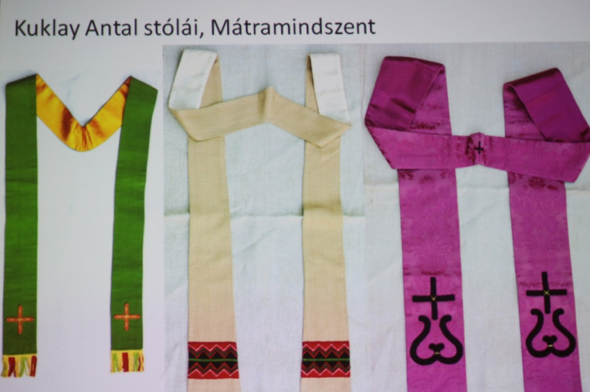 Kontsek Ildikó bemutatott néhány olyan liturgikus ruhát is, melyet az utóbbi évtizedekben készítettek magyar alkotók: egy Kákonyi Asztrik OFM tervei alapján szőtt oltárterítőt; Kecskés Ágnes Stólák és oltárterítő elnevezésű tárgyegyüttesét; Redeczki Anna hímzéseit; illetve a Hager Ritta által Varga Lajos segédpüspök részére hímzett miseruhát. A résztvevők láthatták Pákozdi István katolikus pap újmisés miseruháját is, valamint az előadó bemutatta fényképen azt a liturgikus teret, melyet Henri Matisse 1948–51 között a vence-i domonkos nővérek Rózsafüzér-kápolnájában alakított ki, és amelyhez a művész textíliákat is alkotott.