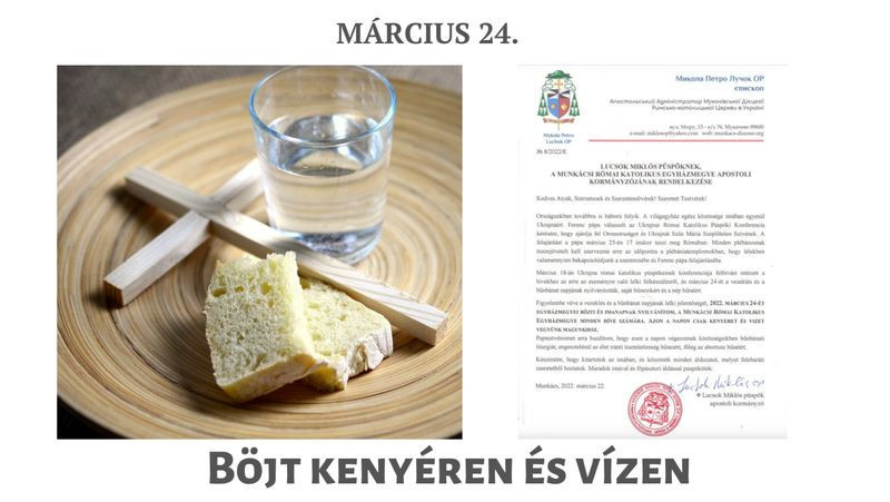 Figyelembe véve a vezeklés és a bűnbánat napjának lelki jelentőségét, 2022. március 24-ét egyházmegyei böjti és imanapnak nyilvánítom, a Munkácsi Római Katolikus Egyházmegye minden híve számára. Azon a napon csak kenyeret és vizet vegyünk magunkhoz.