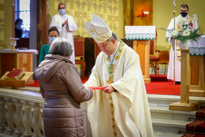 A szentmise végén a főpásztor oklevelet adott át a kiskunhalasi karitászcsoport vezetőjének, Kuti Sándorné Kovács Máriának, aki a harmincéves helyi közösség lelkes és példamutató vezetője.