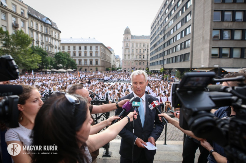 A szentmise előtt a helyszínen Soltész Miklós, az Emmi egyházi, nemzetiségi és civil társadalmi kapcsolatokért felelős államtitkára és Gyetván Gábor, az EKIF igazgatója sajtótájékoztatót tartott. – Közel 16 ezer gyerek tanul a fővárosi egyházi iskolákban – mondta az EKIF igazgatója –, „nagy öröm, hogy megmutathatjuk a társadalom felé, milyen sok gyermek tanul a katolikus intézményeinkben, s hogy milyen jó a hangulat”.