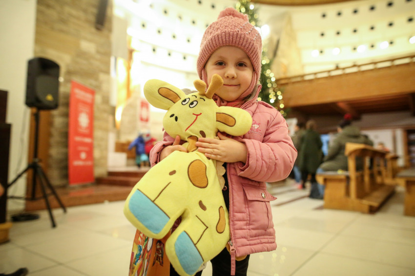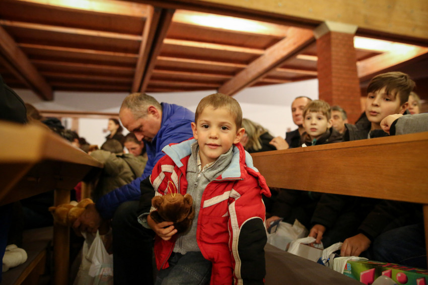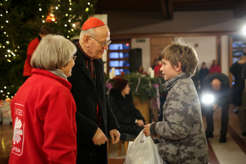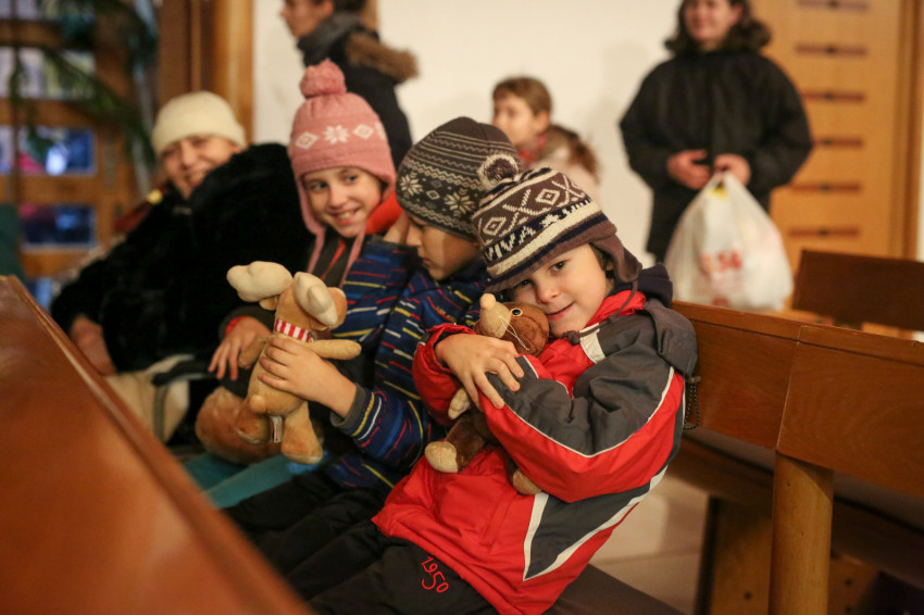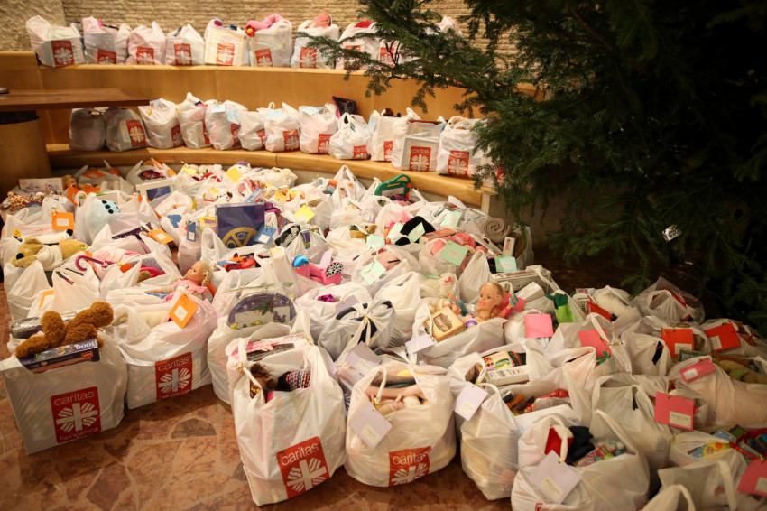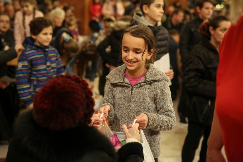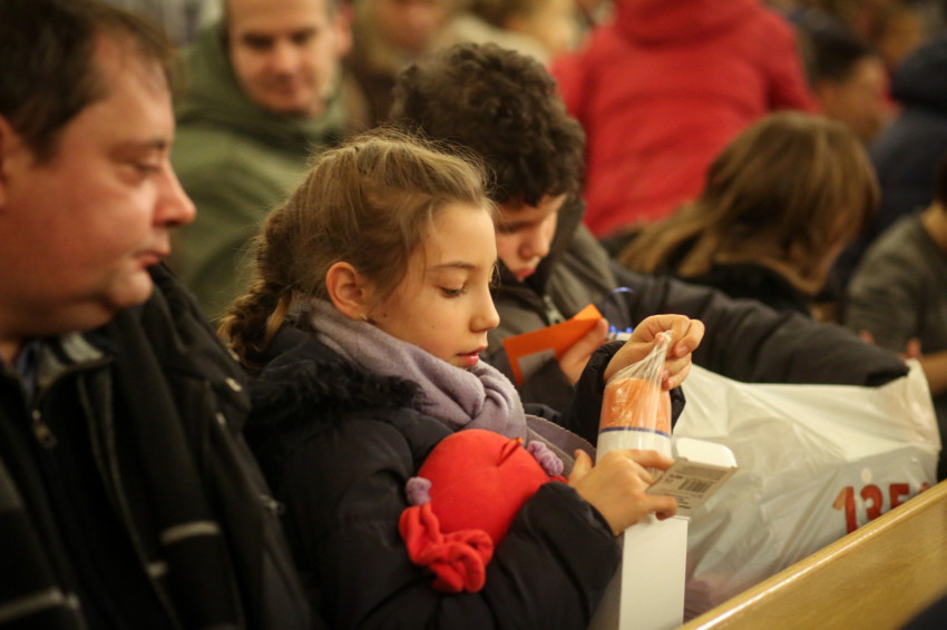 A köszöntő után egyre hangosabb lett a templom, hiszen Márton Andra, a karitász irodavezetője egyenként szólította a gyerekeket, majd Mádl Dalma asszony a lányoknak, Erdő Péter bíboros pedig a fiúknak osztotta ki a csomagokat. Izgatott zsibongás hallatszott a templomban, néhol egy kisautónak örült valaki, más egy régóta vágyott társasjátéknak, zseblámpának örült meg.
