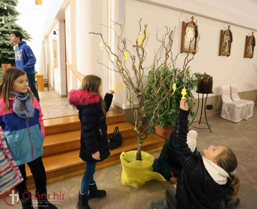 A játékos előadás utáni szünetben sem tétlenkedtek a királyfiak és királylányok: az agapé mellett volt idejük arra is, hogy összeszedjék gondolataikat, mit szeretnének Istennek megköszönni. Ezt felírhatták az Oltáriszentséget ábrázoló papírformára, amit elhelyeztek az élet fáján.