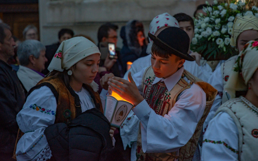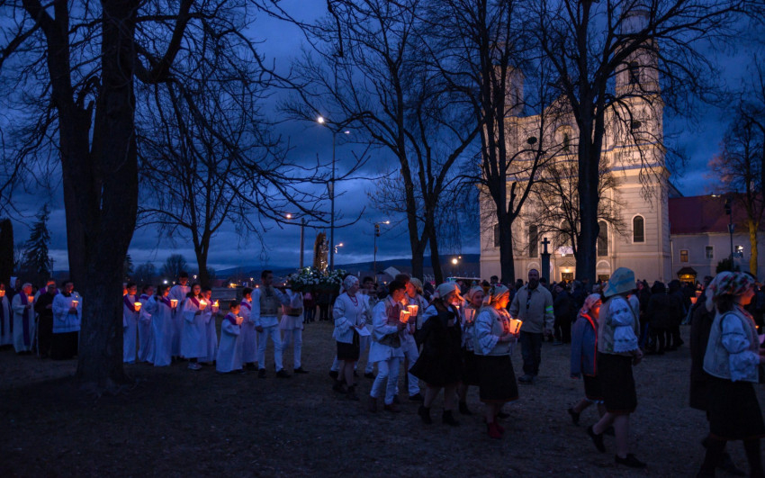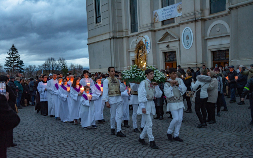A szentmise után a gyimesi fiatalok vezetésével a fájdalmas rózsafüzért imádkozták a zarándokok, majd megtartották a gyertyás körmenetet.
