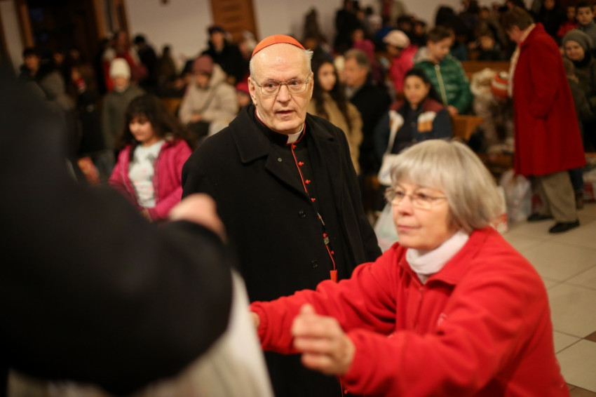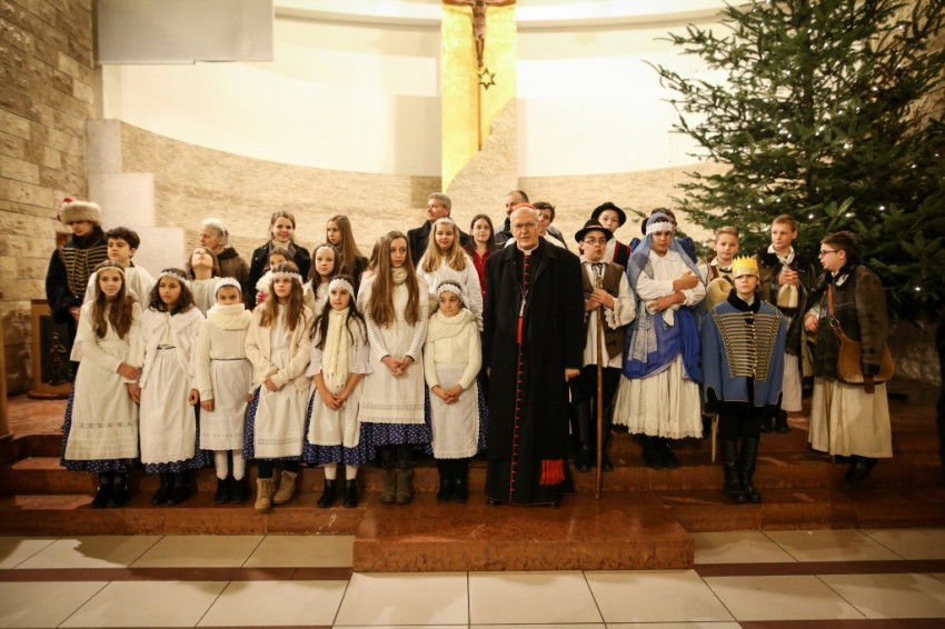 Az ünneplőket köszöntve Erdő Péter bíboros hangsúlyozta, karácsonykor Jézus Krisztus születését ünnepeljük. „Ő a legnagyobb ajándék, akit Istentől kapott az emberiség. Jézus születésével azt ünnepeljük, hogy Isten magára vállalta a mi emberi sorsunkat, mert annyira szeretett minket.” Mi mindannyian Istentől ajándékba kaptuk az életünket, és mindazt a szépet és jót, ami ezzel együtt a miénk lett. Ezeket a javakat ajándékozzuk tovább. Karácsonykor mi is ajándékozunk, hogy másoknak is örömet szerezzünk. „Remélem, hogy mindenki azt az ajándékot kapja most, amiről álmodott. Kegyelemteljes, békés karácsonyt kívánok mindenkinek!” – zárta köszöntőjét a főpásztor.