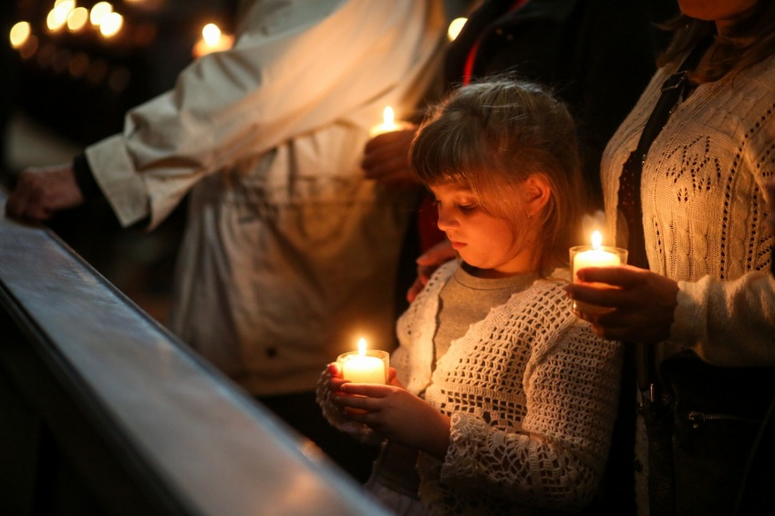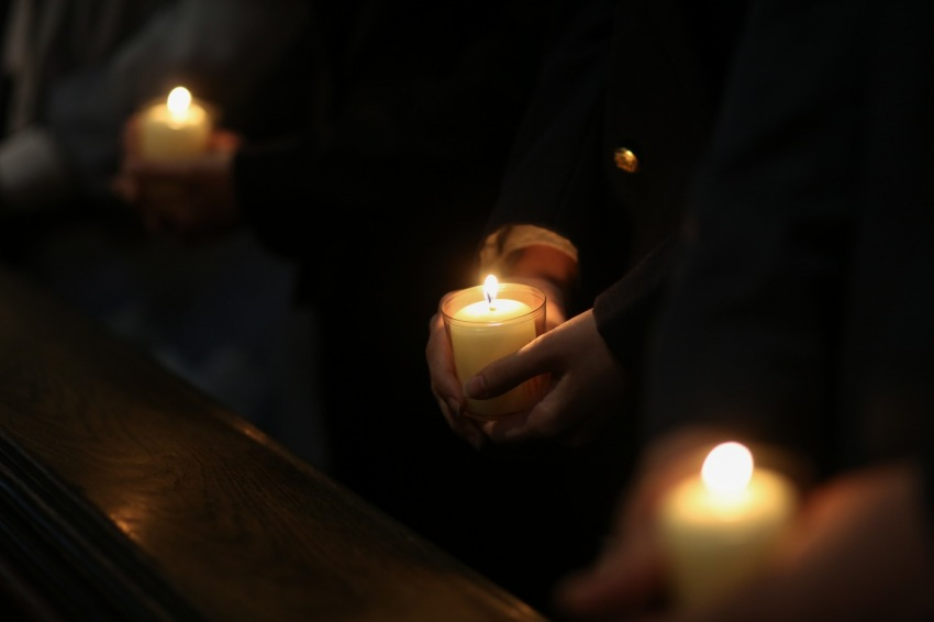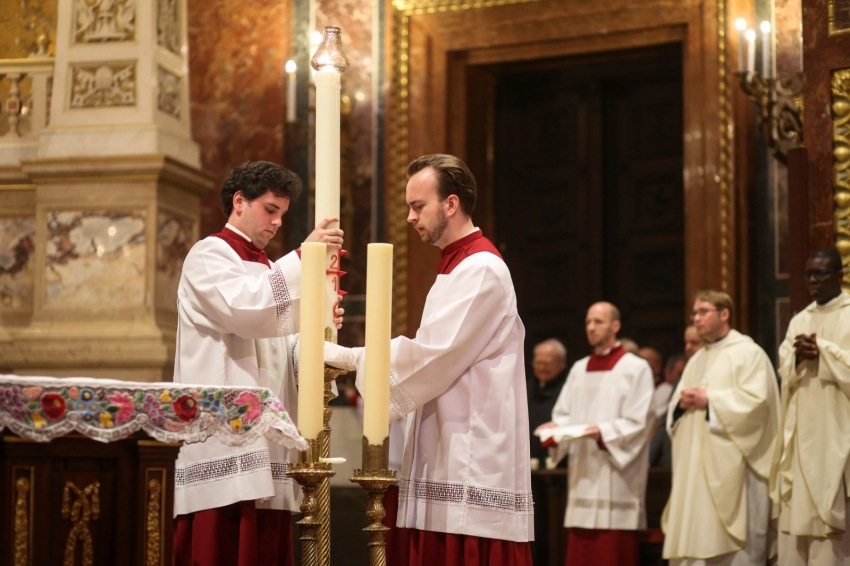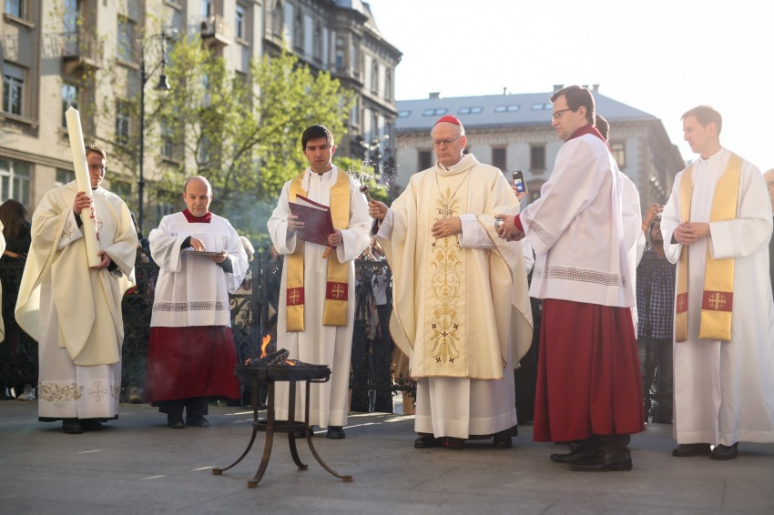 A bíboros által vezetett húsvéti vigília a bazilika lépcsői előtt a tűzszentelés szertartásával kezdődött. Miután a főpásztor megáldotta a tüzet, az arról vett lánggal meggyújtották a húsvéti gyertyát, amelyik a halott Jézus testét szimbolizálja, benne a tömjénszegekkel, amelyek Jézus halálos sebeit jelzik. Az Egyház liturgiája megjeleníti a föltámadás pillanatát, ez történik akkor, amikor a gyertya élettelen testét megeleveníti az új tűz. A húsvéti gyertya fénye maga is Jézus Krisztust jelzi, feltámadását, mely belevilágít a templom sötétjébe, de egyúttal a világ sötétjébe is, hogy új reményt adjon.