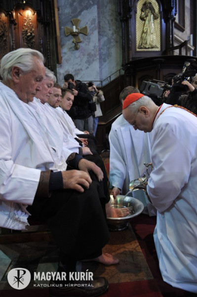 A homíliát követően Krisztus tettére való emlékezésként Erdő Péter az esztergomi plébániákhoz tartozó 12 férfinak mosta meg a lábát a szertartás keretében.