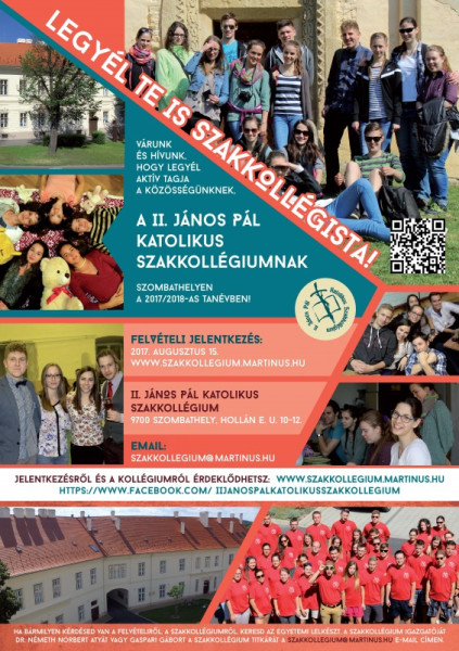 A II. János Pál Katolikus Szakkollégium (Szombathely, Hollán Ernő utca 10–12.) mindazokat a keresztény fiatalokat hívja a közösségébe, akik Szombathelyen tanulnak szeptembertől, és szeretnének egy olyan helyen lakni, amely egyszerre szellemi műhely, nyüzsgő, vidám közösség, és olyan hely, ahol a lélekben is rend születik.