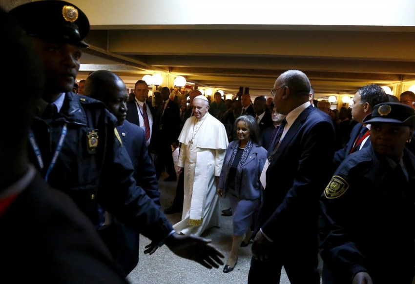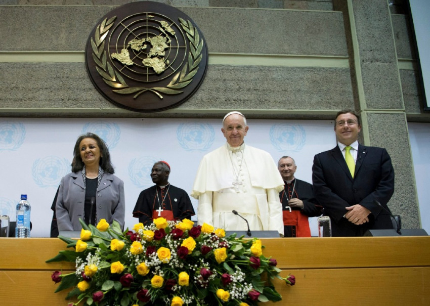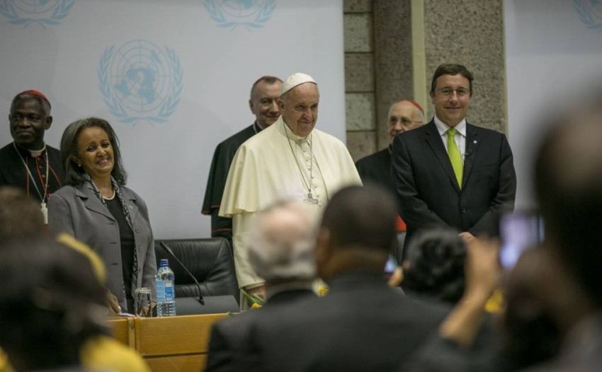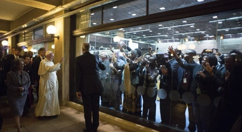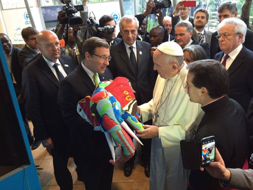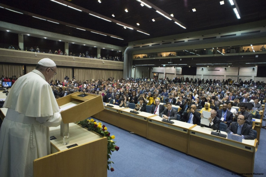 Ferenc pápa megérkezésekor elültetett egy fát az intézmény kertjében, majd beszédet intézett az ENSZ munkatársaihoz. Többször kifejezte reményét, hogy az államok félre tudják tenni az önző érdekeket a klímaváltozás kezelése és a jelenlegi fejlődési modell torzulásainak helyreigazítása érdekében.