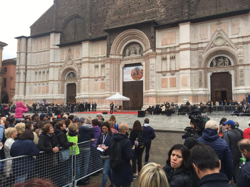 A Szentatya megérkezve Bolognába egy volt laktanya épületébe ment először, ahol a szögesdrót által is védett falak, kapuk mögött ezer arc, ezer történet rejlik. A menedékkérők sárga karkötőjét viselte. Sorban állva vártak rá a menekültek, felé nyújtották kezüket. Bergoglio pápa mindegyikük mellett megállt, egyesével üdvözölte őket, meghallgatta szavaikat, drámai történetük szilánkjait. És elmagyarázta: ahhoz, hogy ne féljünk a migránsoktól, el kell menni közéjük, ahogyan ő tette, különben nem tudhatjuk meg az igazságot és a tudatlanság a félelmet táplálja.