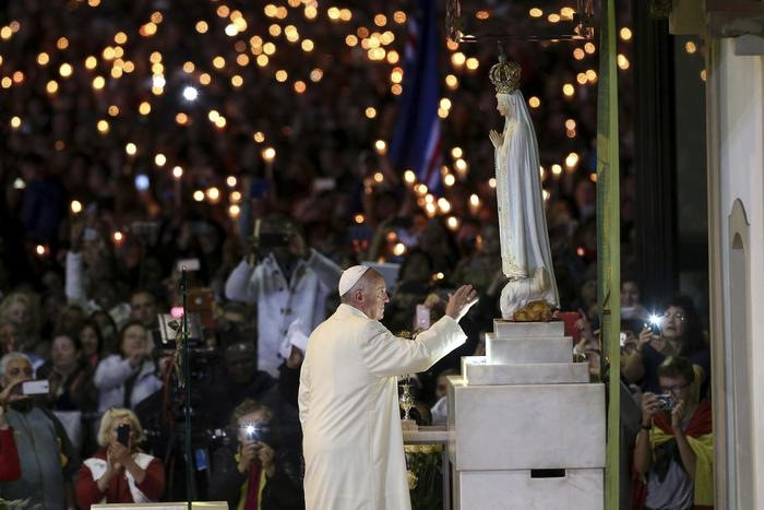 Május 13-án, szombaton délelőtt 10 órakor, a fatimai jelenések kerek száéves évfordulóján Ferenc pápa a Szent Rózsafüzérről elnevezett Miasszonyunk-bazilika előtti téren szentmisét mutatott be, amely során szentté avatta Ferenc és Jácinta látnok gyermekeket. A portugál hatóságok jelentése szerint 500 ezer hívő vett részt a szertartáson. A szentmise végén a pápa külön köszöntötte a betegeket. A szentatya homíliáját hamarosan teljes egészében közreadjuk.