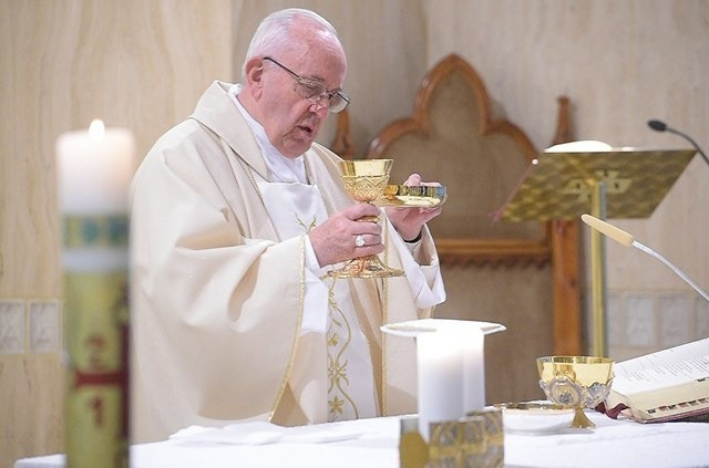Jézus az Eucharisztiával szeretetre tanít minket, a lábmosással pedig a szolgálatra. Azt mondja, hogy egyetlen szolga sem nagyobb az uránál, sem a küldött a küldőjénél. Ez a három dolog képezi az Egyház alapját. A mai szakasz (Jn 13,16–20) János evangéliumából két gesztust ír le, melyek „intézmények” – magyarázta a pápa. Ez a két gesztus jelenti tanításának alapját tanítványai és az eljövendő Egyház számára. Jézus testét és vérét adja, hogy megegyük és megigyuk, vagyis megalapítja az Oltáriszentséget, és megmossa a tanítványok lábát. Ezekből a gesztusokból születik az a két parancsolat, amelyik növeli az Egyházat, ha mi hűségesek vagyunk. Az első a szeretet parancsa: már nemcsak úgy kell szeretnem felebarátomat, mint önmagamat, hanem továbbmenve: „úgy szeressétek felebarátotokat, mint ahogy én szerettelek benneket”.
