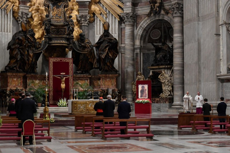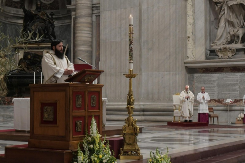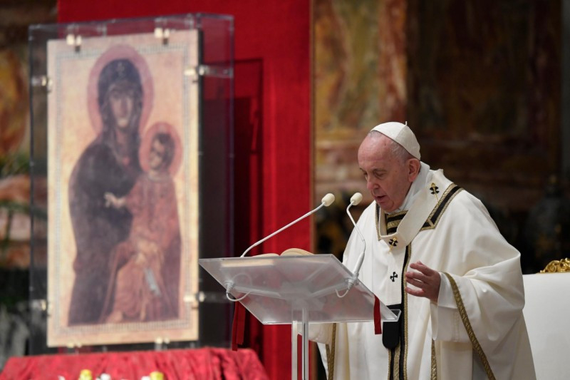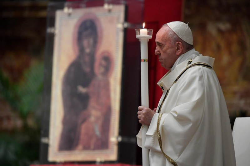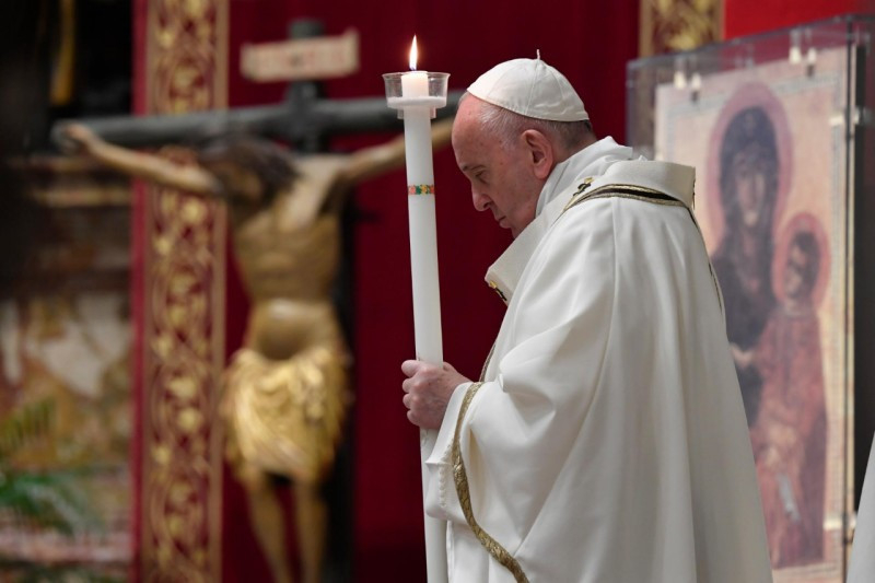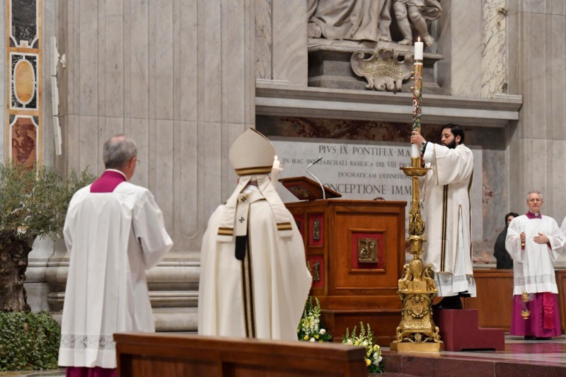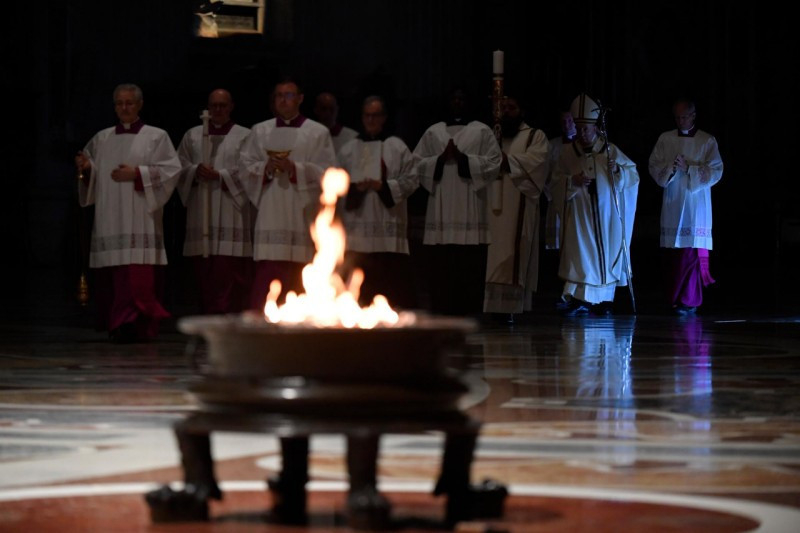 „A szombat elmúltával” (Mt 28,1) a nők a sírhoz mentek. Így kezdődött ennek a vigíliaszertartásnak az evangéliuma: a szombattal. A húsvéti szent három nap közül ezt a napot hanyagoljuk el leginkább, hiszen epedve várjuk, hogy a pénteki kereszttől eljussunk a vasárnapi allelujáig. Ebben az évben azonban jobban átérezzük, mint valaha a nagyszombatot, a nagy csend napját. Magunkra ismerhetünk a nők érzéseiben, melyek azon a napon eltöltötték őket. Hozzánk hasonlóan ott volt a szemükben a szenvedés tragédiája, egy váratlan, túl gyorsan történt tragédiáé. Látták a halált, és ott lakozott a halál a szívükben. A fájdalmat félelem kísérte: ugyanúgy végezhették volna, mint Mesterük? Aztán féltek a jövőtől is: mindent újra kell építeniük. Megsebzett emlékezet, elfojtott remény. Ez volt a legsötétebb óra számukra, ahogyan nekünk is.