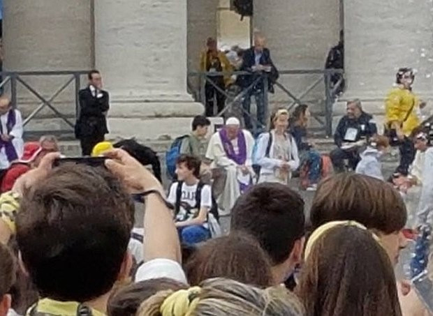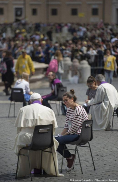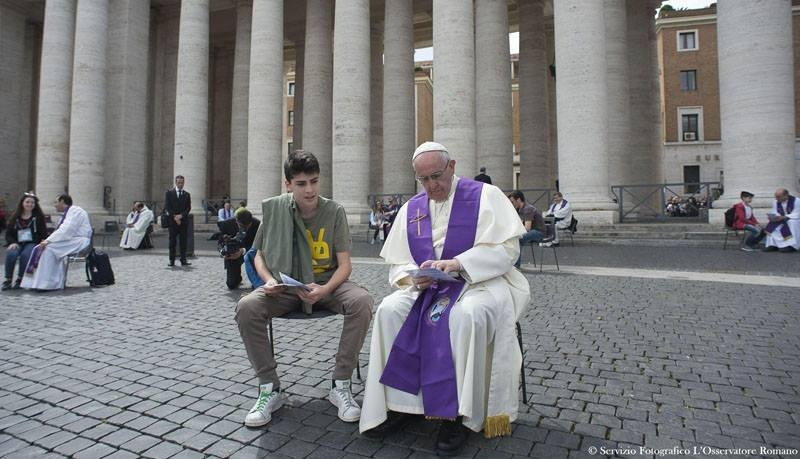 Bernini híres kolonnádjai pedig ölelő karokként fogadják a kamaszokat. Az oszlopok tövénél papok százai ülnek és várják a fiatalokat, hogy elvégezzék a szentgyónásukat. A gyóntató papok közé „beült” Ferenc pápa is a délelőtt folyamán és ott a nagy nyilvánosság előtt, a papok elé térdelve vagy ülve vallották meg bűneiket a fiatalok. Ilyet is régen látott a jó öreg bazilika: tékozló fiúk és lányok térnek vissza vallomásaik révén az atyai házába és a megtisztulás, a kiengesztelődés szentsége révén lelkük ünnepi köntösbe öltözik.