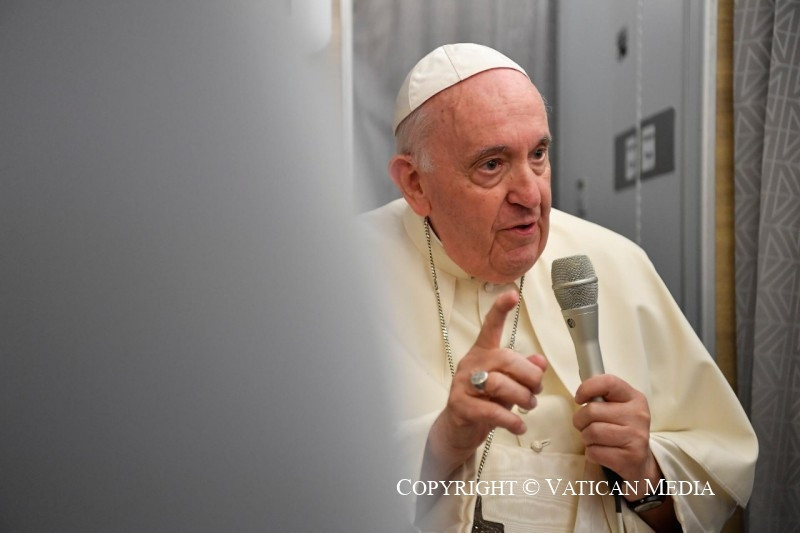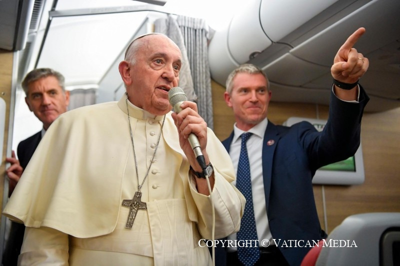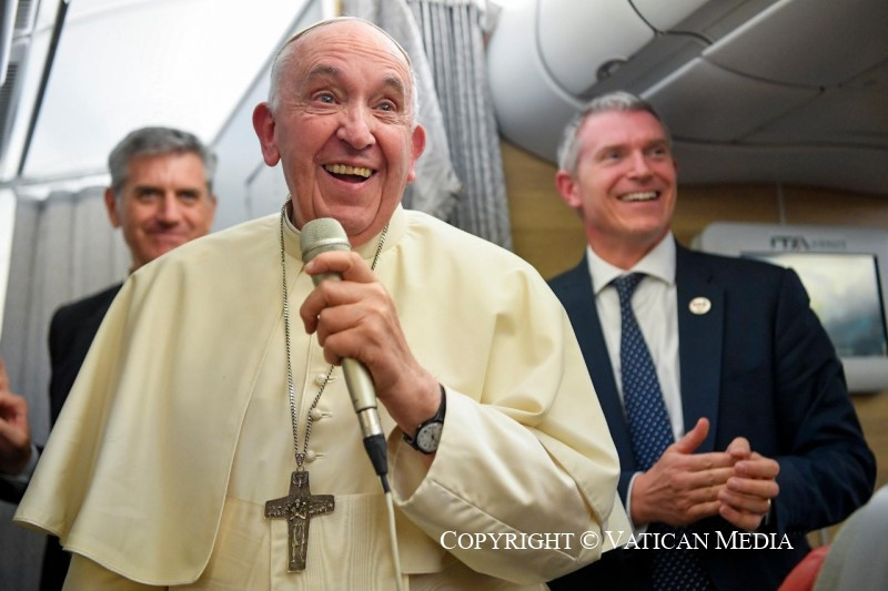 – Jó estét mindenkinek! Szentatya, ezek a napok a zarándoklat és a bűnbánat napjai voltak, különböző szakaszokban, sok találkozással, gesztussal – a legutóbbi megható gesztus Iqaluitban. Ezek a napok – ezt Ön mondta – nem érnek véget azzal, hogy elhagyjuk ezt a földet, és ebben az értelemben is érkezünk most el ehhez a találkozóhoz az újságírókkal. De talán szeretne néhány szót szólni hozzánk, mielőtt elkezdenénk…