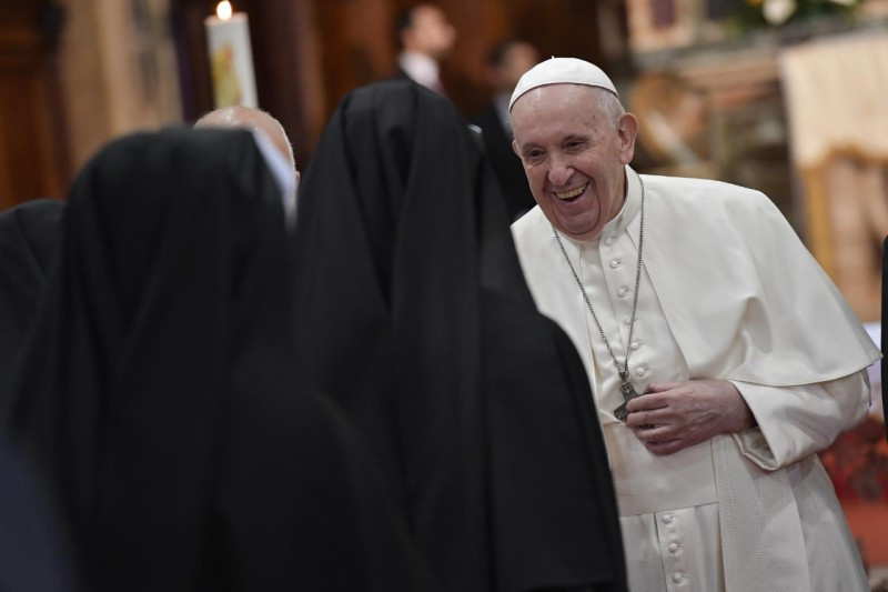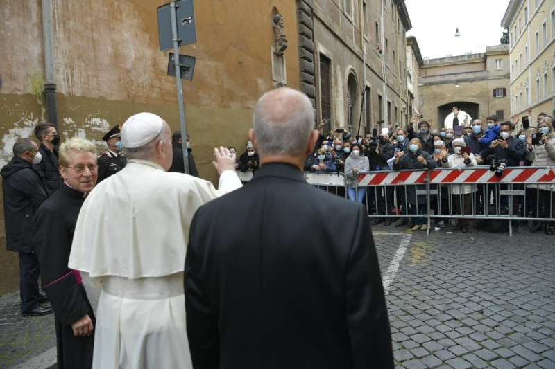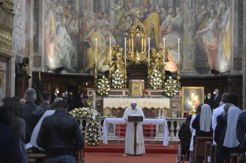Külön köszöntelek titeket, aki itt vagytok a Santo Spirito in Sassia-templomban, az Isteni Irgalmasság kegyhelyén: rendszeres idejáró hívők, ápolószemélyzet, fogvatartottak, fogyatékkal élők, menekültek és migránsok, az Isteni Irgalmasság Kórházi Nővérei, a polgári védelem önkéntesei.