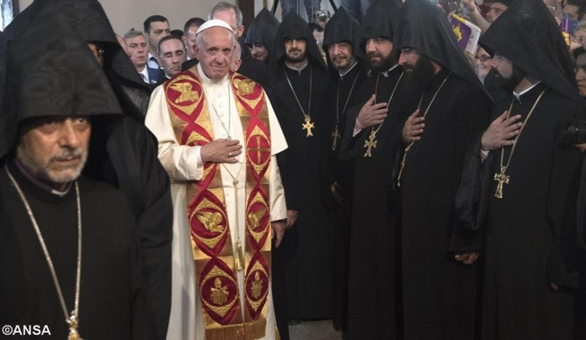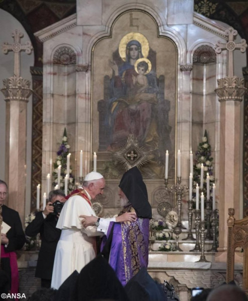 Köszöntöm II. Garegin Őszentségét, Minden Örmény Legfőbb Pátriárkáját és Katholikoszát, akinek szívből köszönetet mondok kedves meghívásáért a szent Ecsmiadzin meglátogatására, köszöntöm továbbá az Örmény Apostoli Egyház érsekeit és püspökeit. Köszönetet mondok mindannyiatoknak a szívélyes és örömteli fogadtatásért. Köszönöm, Őszentsége, hogy befogadott házába; a szeretetnek ez a megnyilvánulása a szavaknál sokkal beszédesebben tanúsítja, mit jelent a barátság és a testvériség.