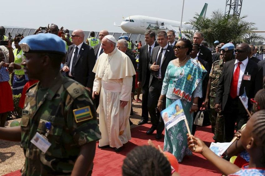 November 29-én, vasárnap délelőtt, az európai időzónával egyidejűleg, tíz óra körül érkezett meg Ferenc pápa a Közép-afrikai Köztársaságba. Két és háromnegyed óra alatt tette meg az 1600 km-es távot Kampala és Bangui repülőtere között. (Szándékosan ment keletről nyugatra, hogy a föld forgásával is időt nyerjen, két órát!).