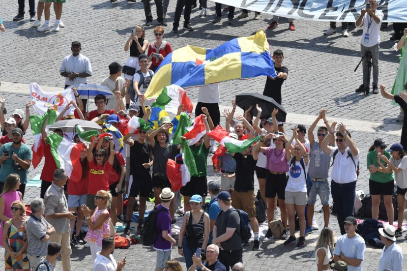 Köszöntelek mindannyiatokat, rómaiak és különböző országokból érkezett zarándokok! Köszöntöm a családokat, a plébániai csoportokat, az egyesületeket. Külön köszöntöm a veronai egyházmegye fiataljait, akik egy iskolai táborban segédkeznek, valamint a Szeplőtelen Fogantatás-egyházközség fiataljait.