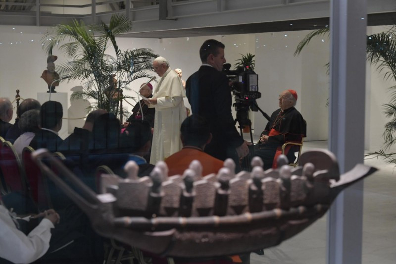 A szépség egyesít minket. Arra hív, hogy éljük meg az emberi testvériséget, szemben állva a harag, a rasszizmus, a nacionalizmus veszélyes kultúrájával. Néhány hónapja ebből a múzeumból vittek Pekingbe kínai művészeti alkotásokat, korábban pedig néhány muszlim országba érkeztek műtárgyak. Hány jó kezdeményezést lehet tenni a művészet révén, amin keresztül felül lehet emelkedni az akadályokon és a távolságon – hangsúlyozta Ferenc pápa, majd köszönetet mondott mindazoknak, akik gondjukba veszik ezeket az értékes tárgyakat. Mindenekelőtt Nicola Mapelli atyát, az Anima mundi múzeum kurátorát említette meg, aki egyébként a Pápai Missziós Művek misszionáriusa. A Szentatya háláját fejezte ki a restaurátorműhely dolgozóinak is, valamint mindazoknak, akik közreműködtek a munkában.