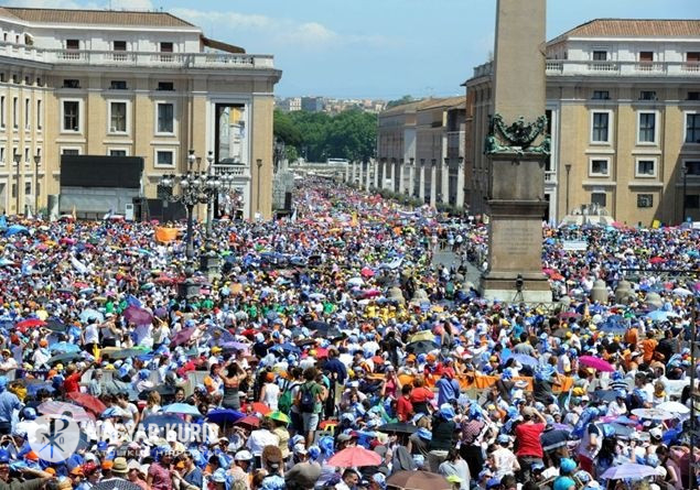A Szent Péter téren tetőfokára hágott a lelkesedés, amikor nem sokkal délután 4 óra után Ferenc pápa megjelent fehér dzsipjén és lassan körbejárta a teret és a környező utcákat, amelyeket megtöltöttek a különféle iskolák diákjai, színes sapkában, hatalmas feliratokkal, sokszínű zsebkendőjükkel köszöntve a Szentatyát. Ferenc pápa átölelte a felé nyújtott kicsinyeket, meghallgatta, megsimogatta őket, megáldotta a szülőket, tanárokat, mindazokat, akik már a reggeli óráktól kezdve vártak a nagy eseményre: „Olaszország iskolái Ferenc pápával”. A bazilika előtti emelvényre egy táblát és egy iskolapadot helyeztek el, rajta könyvekkel. A tér így valóban egy hatalmas tanteremhez hasonlított, amelynek katedráján Péter utóda ült. Az iskola témájával kapcsolatban elhangzott tanúságtételeket követően a pápa beszédet mondott: