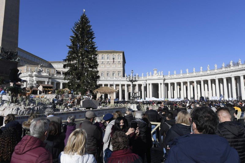 Az új év tehát Istennel kezdődik, aki édesanyja karjában és jászolban fekve kedvesen bátorít bennünket. Szükségünk van erre a bátorításra. A világjárvány miatt még mindig bizonytalan és nehéz időket élünk. Sokan félnek a jövőtől, és sokak életét megterhelik a nehéz szociális helyzetek, a személyes problémák, az ökológiai válságból eredő veszélyek, az igazságtalanságok és a globális gazdasági egyenlőtlenségek. Amikor Máriára nézek, karjában Fiával, a háborúk és éhínség elől menekülő vagy menekülttáborokban várakozó fiatal anyákra és gyermekeikre gondolok. Nagyon sokan vannak! És amikor a Jézust jászolba fektető Máriát szemléljük, hogy ezzel mindenki számára elérhetővé tegye, emlékezzünk arra, hogy a világ csak akkor változik meg, és mindenkinek az élete csak akkor lesz jobb, ha mi magunk is mások rendelkezésére bocsátjuk magunkat, anélkül, hogy arra várnánk, hogy ők kezdjék ezt megtenni. Ha testvériségkézművesekké válunk, képesek leszünk a háborúk és erőszak által megtépázott világ szálait újraszőni.