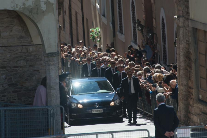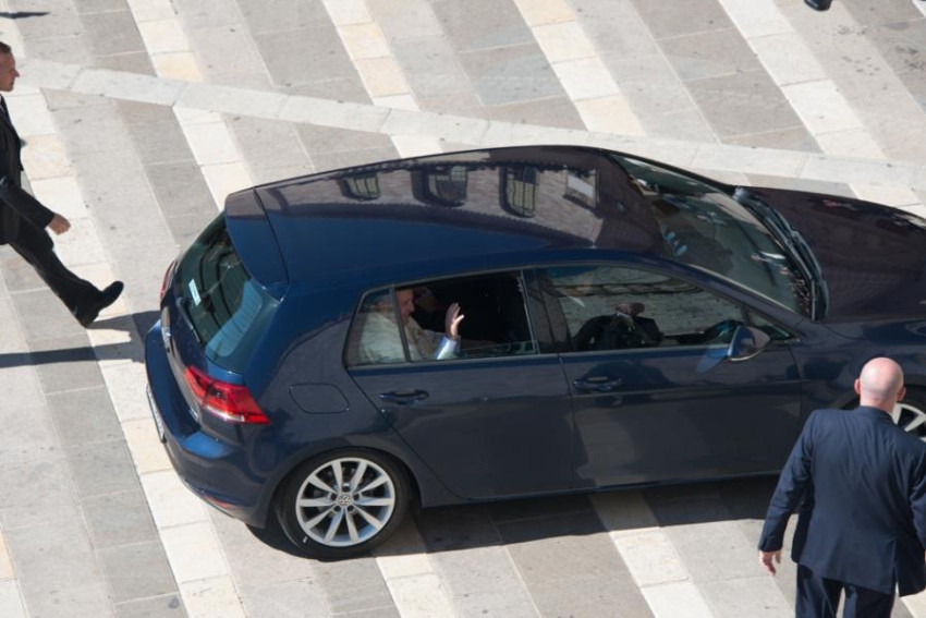 Délelőtt fél 11-kor indult a pápa a Vatikánból helikopterrel. A Santa Maria degli Angeli sportpályájáról fél 12-kor közvetlenül az assisi Szent Konventbe ment, ahol Bartholomaiosz konstantinápolyi pátriárka, II. Ignác Efrém, Antióchia szír ortodox pátriárkája, Justin Welby anglikán prímás, Riccardo Di Segni római főrabbi és Abbász Shuman, a kairói al-Azhar egyetem és szunnita vallási központ elnökhelyettese fogadta.