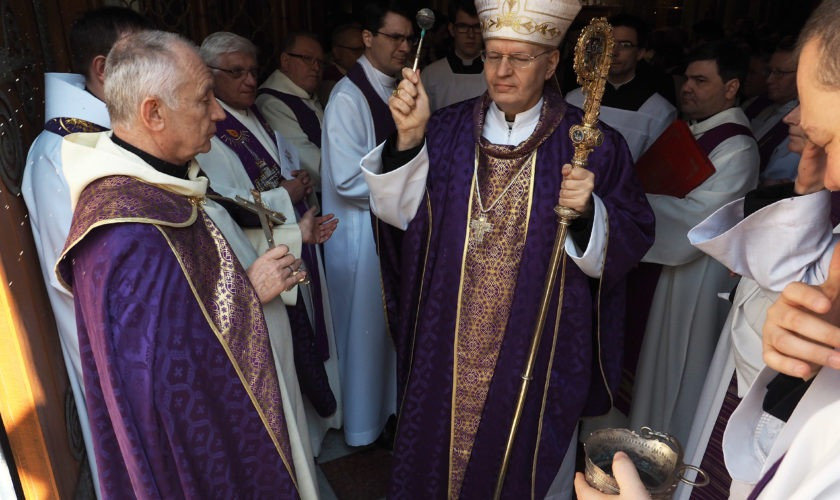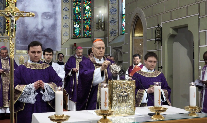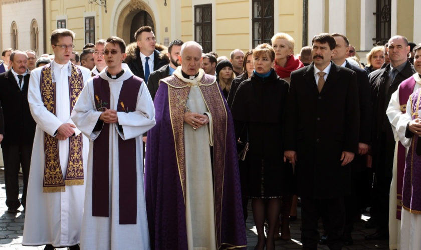 Március 24-én, szombaton délelőtt a főszékesegyházban Erdő Péter bíboros, prímás, esztergom-budapesti érsek mutatta be latin nyelven a szentmisét Veres András győri megyéspüspökkel, a Magyar Katolikus Püspöki Konferencia elnökével; Stanislaw Gadecki poznani érsekkel, a Lengyel Katolikus Püspöki Konferencia elnökével; Márfi Gyula veszprémi érsekkel, a Veszprémi Főegyházmegye papságával, valamint Lengyelországból érkezett atyákkal, köztük a lengyel elnök káplánjával. Az olvasmány és az evangélium magyarul és lengyelül hangzott el.