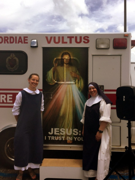 A Keresztre Feszített Jézus Közössége néhány nővére kíséri Champagne atyát a spirituális sürgősségi mentő útjain. Általában forgalmas helyeken parkolnak, ahol az emberek mindennapos feladataikat intézik. Vannak, akik nem vesznek tudomást a kocsiról, melyből zene szól, és egy életnagyságú Irgalmas Jézus-kép van az oldalán. De a legtöbben mosolyognak, integetnek. Sokan odamennek a nővérekhez, megölelik őket, és megköszönik nekik a munkájukat. Vannak, akik csak egy imára állnak meg, mások gyónnak is.
