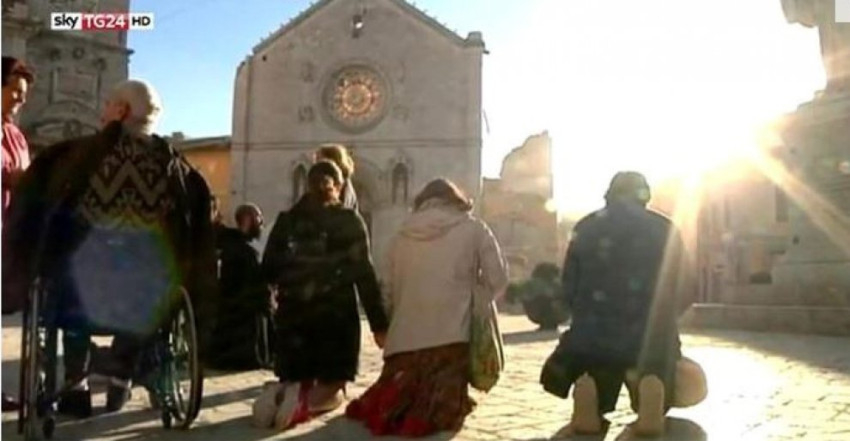 Az egész világot bejárta az a megindító kép, amelyen a földrengés után szerzetesek és világiak együtt imádkoznak térden állva a leomlott bazilika homlokzata előtt. Benedikt Nivakoff úgy véli, a térdeplő ember képe mindig a bűnbánatot idézi, azt a pillanatot, amikor rádöbbenünk, hogy hibáztunk. Ezért nagyon fontos megkérdezni magunktól egy ilyen tragédia után: „Isten megmentette az életemet, miért? Miben kell változnom?”