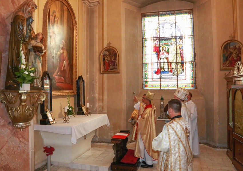 A szentmise előtt a főpásztor megáldotta a templomban a restaurált Szent István-képet, majd asszisztenciájával a cinteremben (a templomudvaron, mely egykor temetkezési helyként is szolgált) felállított oltárhoz vonult, hogy megkezdje a legszentebb áldozat bemutatását. „Ahhoz, hogy mi most ünnepelhessünk, nagyon sokak áldozatára volt szükség. Mi valakiknek a gyermekei, az unokái, a dédunokái vagyunk. Mindenki meghozta a maga áldozatát” – mondta Schönberger Jenő.