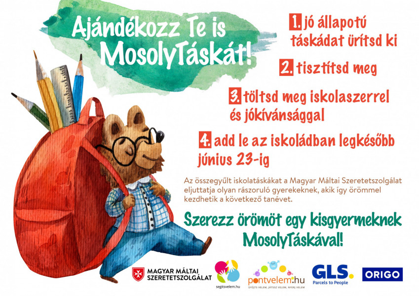 Jótékonysággal zárni az idei tanévet, hogy örömmel lehessen kezdeni a következőt – így lehet összefoglalni a PontVelem Okos Program, a Magyar Máltai Szeretetszolgálat és a GLS Hungary közös iskolai kampányát. MosolyTáska néven indul idén is tanév végi jótékonysági akció az általános iskolákban. A gyűjtés célja, hogy a gyerekek segítséget nyújtsanak nehéz helyzetben élő kortársaiknak, hogy új iskolatáskával kezdhessék a következő tanévet.