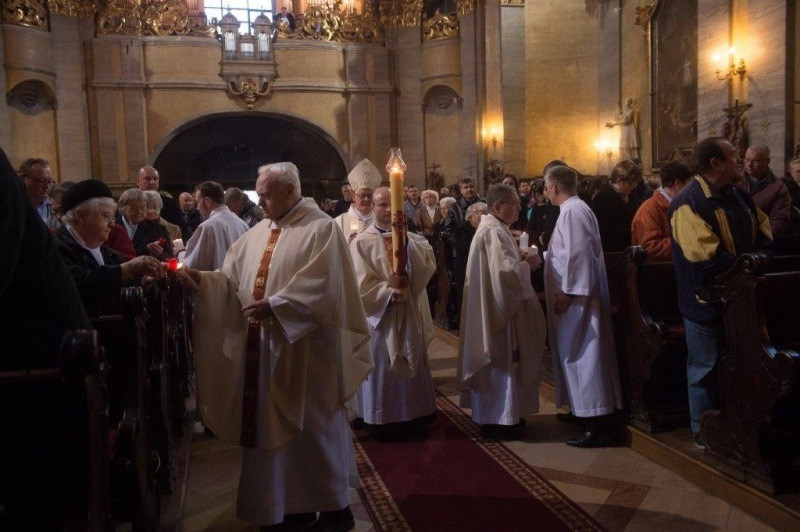 A főpásztor a sötét templomba a megáldott gyertyával hozta be a fényt, és énekelve hirdette: „Krisztus világossága!" A húsvéti gyertyáról gyújtották meg a templomban összegyűlt közösség gyertyáit. Az igeliturgia, melyet a húsvéti örömének vezetett be, még a félhomályban zajlott. Az ószövetségi olvasmányok után fölgyúltak a fények, és fölzúgtak a templom harangjai, megszólaltak a csengők. Az evangélium felolvasása után a jelenlévők megújították keresztségi fogadalmukat. Ezt követte a víz megáldása és a mindenszentek litániájának elimádkozása. A püspök végigjárt a sorok között és szenteltvízzel hintette meg a híveket. A mise ünnepélyesen folytatódott, majd a békeköszöntés alatt az Oltáriszentség is visszatért a templombelsőbe.
