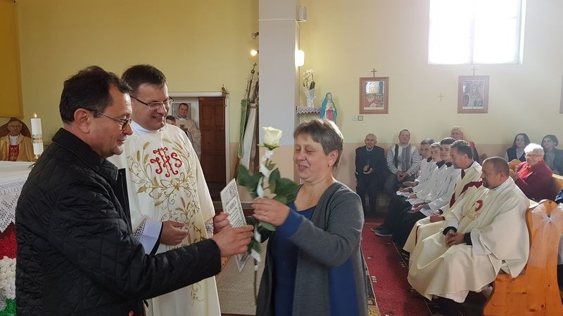 A szentmisét ünnepi körmenet követte, majd Mikulyák László plébános és Oniszkó György kurátor az egyházközség elismerő oklevelében részesítették azokat a híveket, akik az elmúlt húsz esztendőben aktívan kapcsolódtak be az egyházközség életébe. Köztük van Popovics Adél, aki már a templom megépülése előtt elvállalta az orgonista és kántori szolgálatot, s azt mind a mai napig hűségesen végzi.