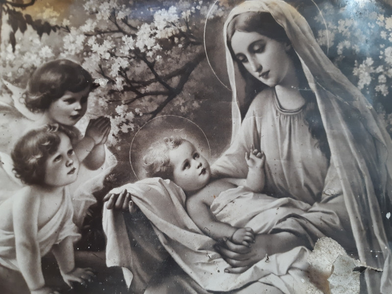 A kiállított képeket az ünnepkörhöz tarozó irodalmi anyaggal színesítették. A legrégebbi szentkép 1958-ból való, amelyen Mária a kisdeddel és az angyalokkal látható.
