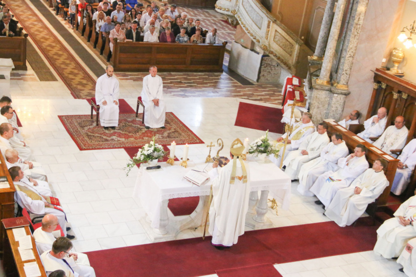 Az evangéliumi részlet felolvasása után kezdődött a diakónusszentelés szertartása. Név szerint bemutatták a püspöknek a szentelendőket, ők pedig jelentkeztek az Úr akaratának teljesítésére a zsoltáros szavaival: „Íme, itt vagyok, hogy akaratodat megtegyem Istenem.” Ezt követően mondta el homíliáját Schönberger Jenő püspök, melyben a diakónus feladatairól elmélkedett. „Egy diakónusnak a legfőbb feladata, hogy szolgáljon az oltárnál, az Ige asztalánál, a házasságkötéseknél, a temetéseken, hittanórákon. A diakónus tehát hirdeti az Igét, és ehhez sokat kell, hogy tanuljon. Ne hagyjátok abba a Szentírás tanulmányozását, mert csak az tudja Isten Igéjét hitelesen hirdetni, aki ismeri is Jézusnak a tanítását. Az igehirdetés Istentől kapott feladatotok, és megtiszteltetés is egyben.”