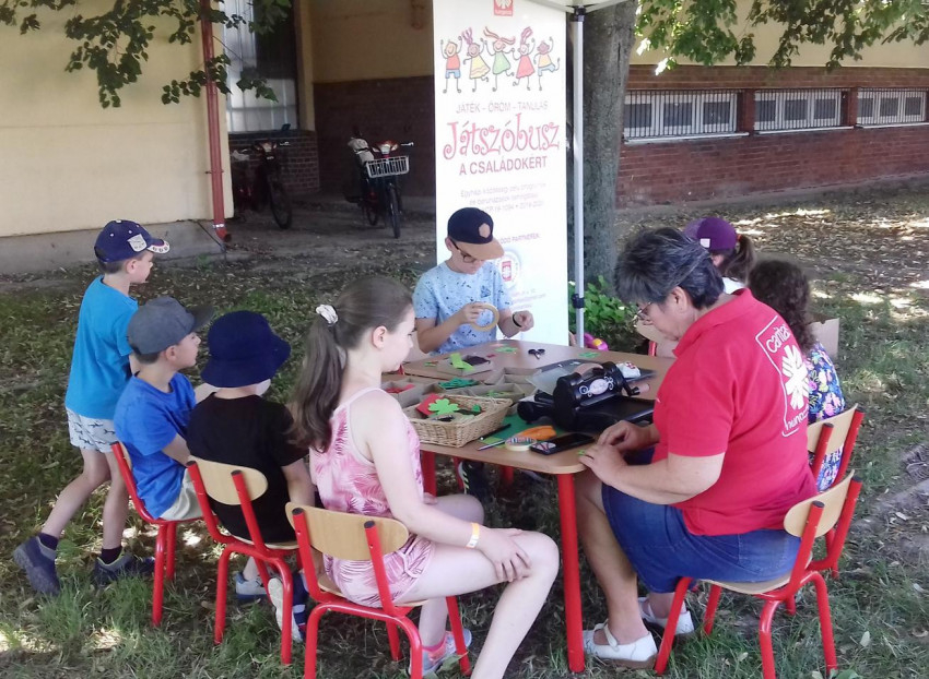A játszóbusz első állomása a szákszendi karitászcsoport által szervezett ötnapos napközis tábor volt, melynek nyitónapján az alsó tagozatos gyerekek kézműves- és ügyességi foglalkozások, valamint mesesarok és az úgynevezett Karitász-kisokos révén fejleszthették tudásukat.