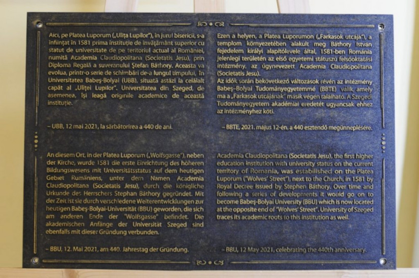 Végül a rektor megköszönte a református egyház vezetőinek, akik a Mátyás király által építtetett Farkas utcai templomot ma használják, hogy engedélyezték egy emléktábla elhelyezését, mely helyen állt a Báthory István által 1581-ben alapított és jezsuita vezetéssel indult egykori alma mater, az Academia Claudiopolitana.