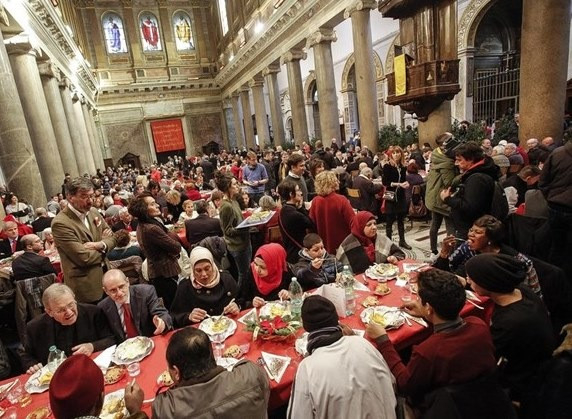 Rómában, a trasteverei Szűz Mária-templomban szervezték meg 1982. december 25-én a szegényekkel való első karácsonyi ebédet, egy kis csoport hajléktalan és idős ember részvételével.