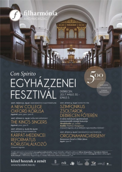 Szintén világklasszis együttes a King’s Singers a capella formációja, amely június 2-án a debreceni Kölcsey központban Saint-Saëns, Brahms, Chilcott darabjai mellett – tisztelegve a magyar közönség előtt – Kodály Mátrai képek és Galántai táncok című kórusműveit adja elő. A debreceni Kodály Filharmonikusokat és a Kodály Kórust Somogyi-Tóth Dániel és Szabó Sipos Máté dirigálja. Az eseménysorozat pünkösd hétfőn Karasszon Dezső és Pálúr János orgonahangversenyével zárul.