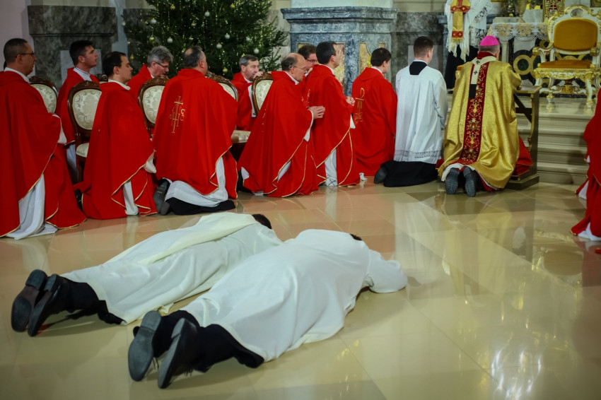A jelöltek ezután ígéretet tettek az imára, a zsolozsma végzésére, a buzgó szolgálatra, és az Egyház hagyománya szerint arcra borulva készültek fel a szentelés pillanatára, miközben fejük felett a Mindenszentek litániáját énekelték. A főpásztor kézrátétele és felszentelő imája után magukra öltötték a stólát és a szerpapok ruháját a dalmatikát, és a szentmise további részében már új szolgálattevőként vettek részt.