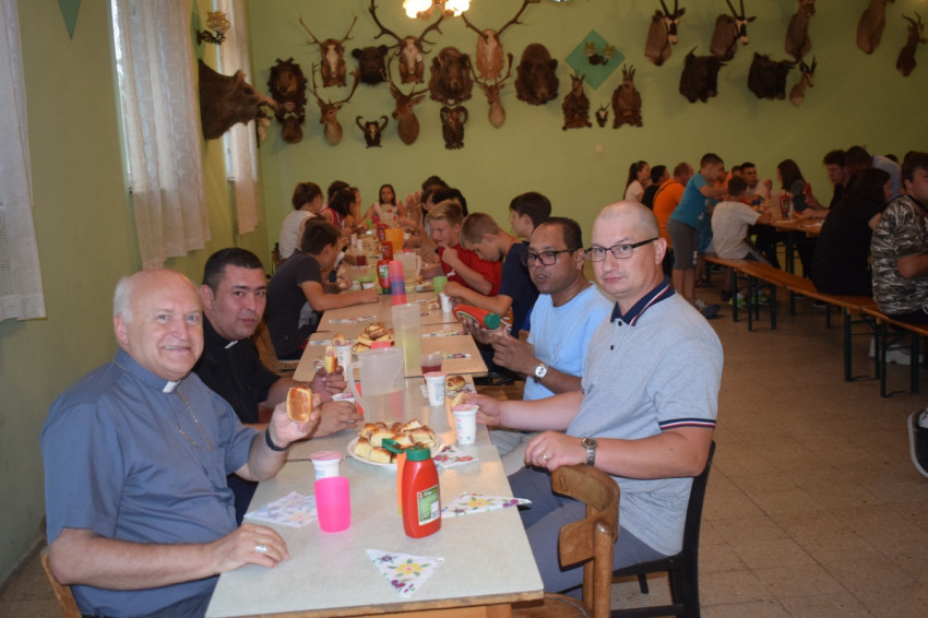 Német László SVD püspök atya is meglátogatta a táborozókat Fehér Roland atya kíséretében. A gyermekek örömmel mutatták be, hogy megtanultak angolul énekelve és táncolva imádkozni, ebben a püspök atya is boldogan vett részt.