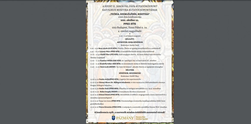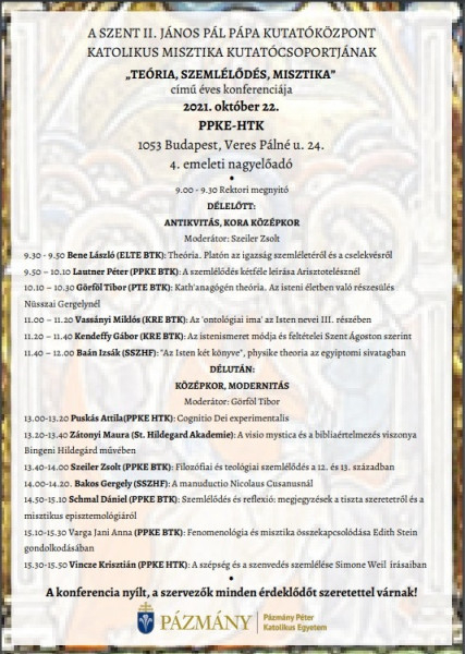 A Teória, szemlélődés, misztika című szimpózium a szemlélődés filozófiai és teológiai hagyományai felől kísérli meg a keresztény misztika sokrétű, összetett valóságának megértését. Az előadók egy-egy terület országosan elismert kiváló szakértői: a PPKE, továbbá az Eötvös Loránd Tudományegyetem, a Károli Gáspár Református Egyetem, a Pécsi Tudományegyetem, a Sapientia Hittudományi Főiskola és az eibingeni St. Hildegard-Akademie kutatói és tanárai.