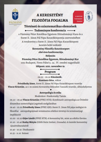 A PPKE Hittudományi Kara és Szent II. János Pál Pápa Kutatóközpontja szervezésében megvalósuló A keresztény filozófia fogalma – Történeti és szisztematikus elemzések című konferencia a kutatóközpont Keresztény Filozófia Kutatócsoportjának első éves konferenciája.