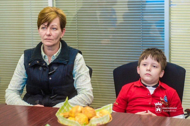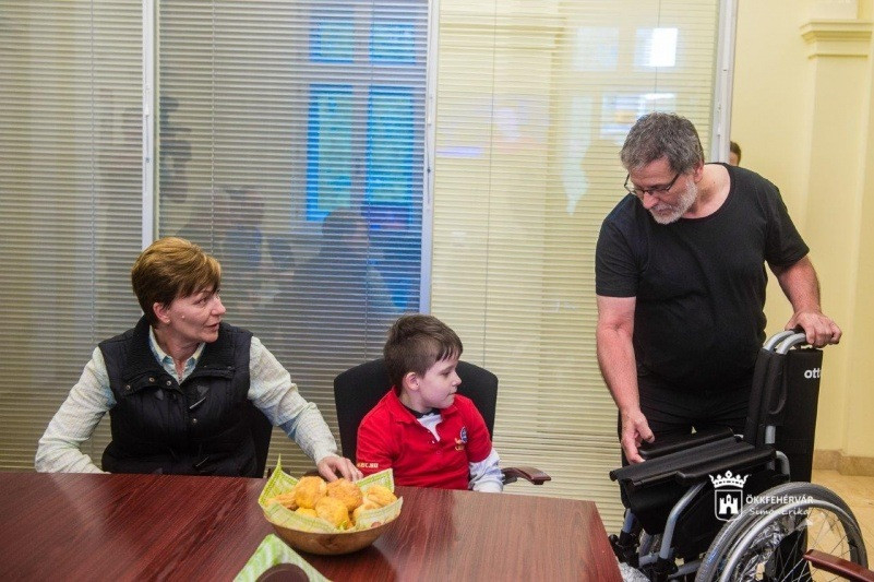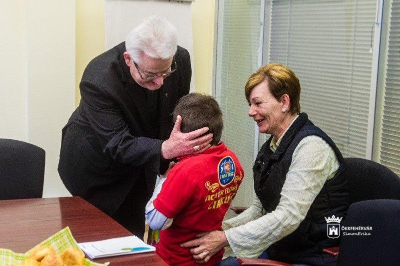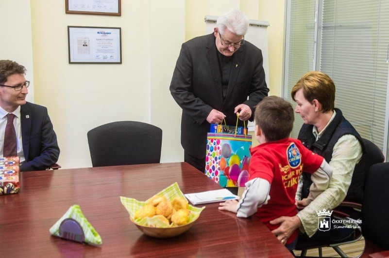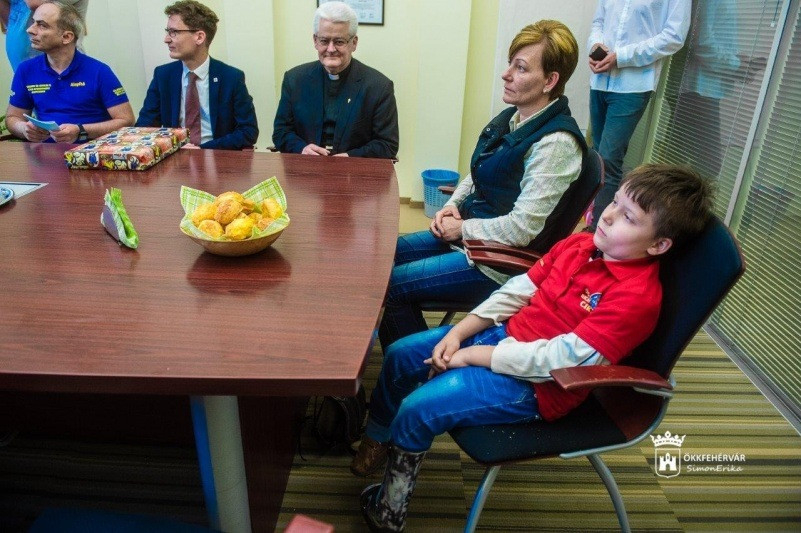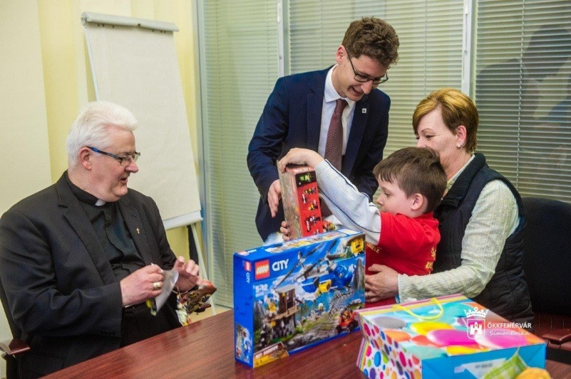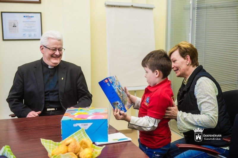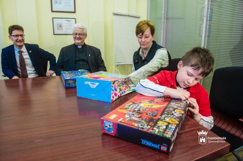 Az ajándékozásra a Fejér Megyei Hírlap székházában került sor. A kisfiú Richter Flórián cirkuszművésztől kerekesszéket, Cser-Palkovics András polgármestertől és Spányi Antal megyéspüspöktől pedig speciális futóbiciklit és játékokat kapott.