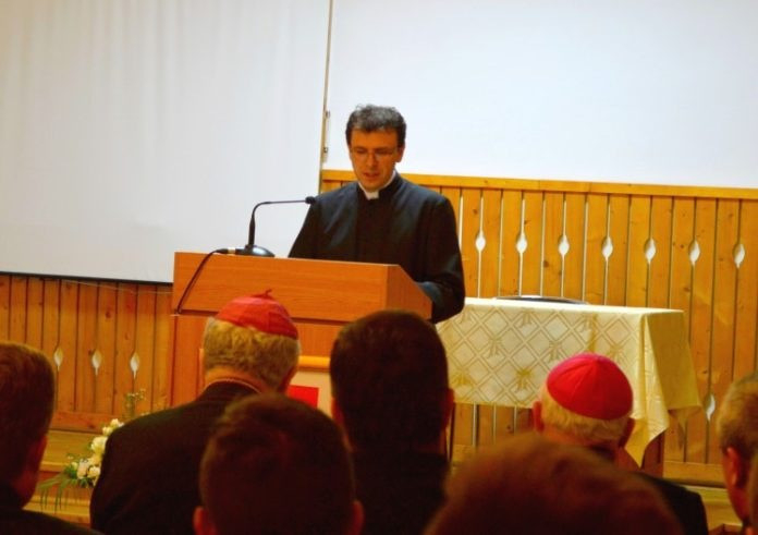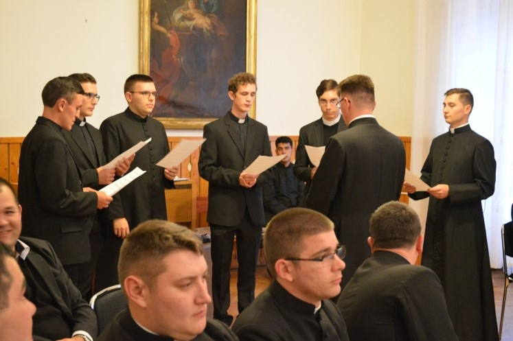„A kutyát és a papot a szájáért tartják!” – idézte a népi mondást Vik János dékán köszöntőjében. Azzal kapcsolatban, hogy mi értelme ma hittudományt művelni, kifejtette, hogy mindamellett, hogy a papszentelés feltétele a teológia művelése, fontos, hogy a papságra készülők ne csak „papoljanak”, avagy kioktassanak, mondanivaló nélkül beszéljenek, hanem a jó emberismerő kutyához hasonlóan megtanuljanak figyelni, hallgatni. Hangsúlyozta, a papságra készülők célja nem a népszerűség, hanem az, hogy emberközeliek legyenek. A teológia tanulása a figyelmes hallgatásra képezze a kispapokat, hogy majd a rájuk bízottak merjenek elindulni, megkeresni saját személyes válaszukat életük nagy kérdéseire. Ábrahám alakját állította a növendékek elé, aki az ígéret után indult útnak. Mindannyiunknak küldetése van a világban, hogy azt alakítsuk, szebbé tegyük. Utunk célja, hogy megérkezzünk Istenhez, aki mindig nagyobb a mi félelmeinknél, a szenvedéseknél, amik ránk várnak – fejtette ki a dékán.