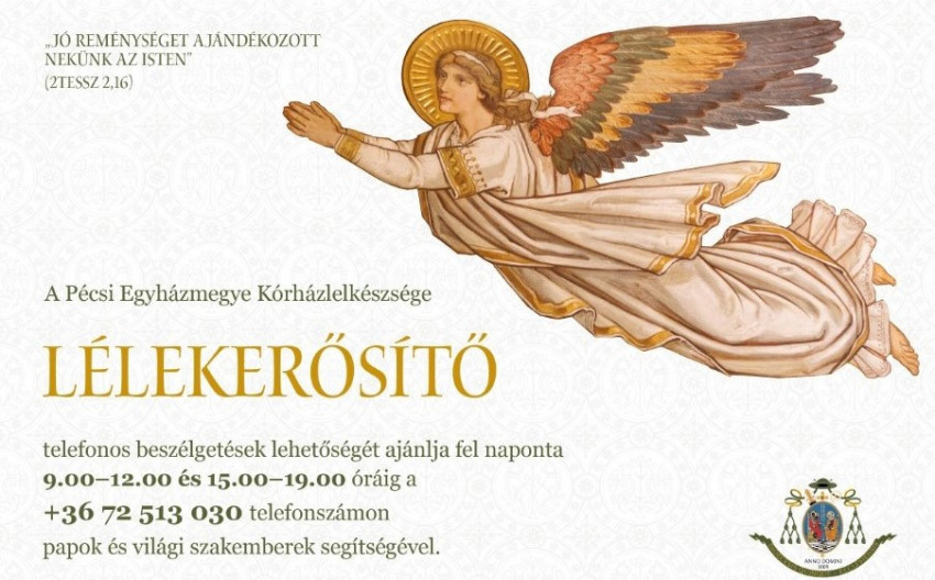 A Pécsi Egyházmegye a kialakult járványügyi helyzetben Lélekerősítő névvel telefonos beszélgetések lehetőségét ajánlja fel azoknak, akik a napok múlásával felmerülő lelki nehézségeikben ilyen formában szeretnének segítséget találni.