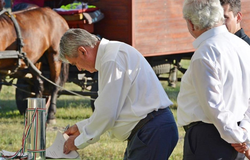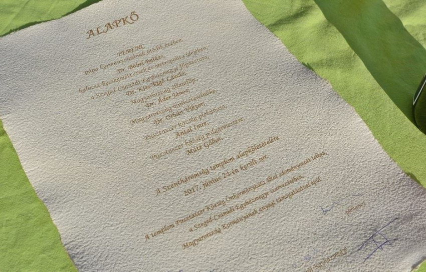 Ezt követően Máté Gábor, Kiss-Rigó László, Farkas Sándor és Antal Imre közösen aláírták az alapkőletételre készült emléklapot, amelyet időkapszulába helyeztek. Emellett a Pusztaszeri Hírfutár négy száma, két képeslap, egyiken az Árpád-emlékmű, másikon pusztaszeri építmények, tájképek fotói, a templomot tervező Germán Géza tervei és egy memóriakártya is bekerült a tartályba. Utóbbin a község elmúlt tíz-tizenöt évének 600-700 fényképét rögzítették, valamint az ünnepélyes alapkőletétel napján készült fotók egy részét, érdekes információkat tartogatva a jövő nemzedékeinek.