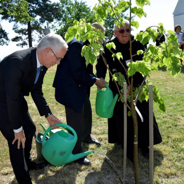 Balog Zoltán, az emberi erőforrások minisztere, Henri Boulad jezsuita szerzetes és Korzenszky Richárd bencés perjel megöntözi a 2016-ban a jövőbe vetett remény és a közös cselekvés szimbólumaként elültetett „konferencia fáját” a vallásközi konferencia második napján a Tihanyi Bencés Apátság közelében.