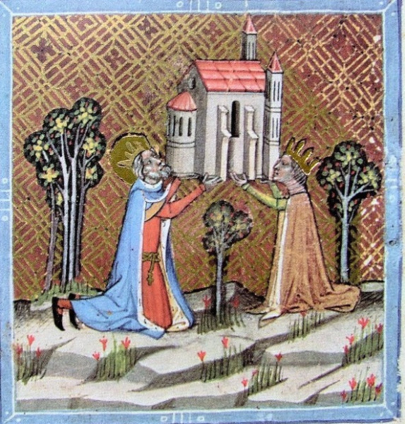 Illusztráció: István és Gizella megalapítják az óbudai Péter-Pál templomot (miniatúra a Képes krónikából)