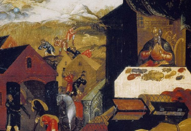 Abban az időben, amikor Jézus tanított, valaki megszólalt a sokaságból: „Mester, szólj testvéremnek, hogy ossza meg velem az örökséget!” Ő így válaszolt neki: „Ember, ki hatalmazott fel engem, hogy bírátok legyek, és elosszam örökségteket?” Majd a tömeghez fordult: „Vigyázzatok, és őrizkedjetek minden kapzsiságtól, mert nem a vagyonban való bővelkedéstől függ az ember élete”. Példabeszédet is mondott nekik: „Egy gazdag embernek a földje bőséges termést hozott, így okoskodott magában: »Mit tegyek? Nincs hová gyűjtenem a termésemet. Tudom már, mit teszek: lebontom csűreimet és nagyobbakat építek, oda gyűjtöm majd a termést és minden vagyonomat. Aztán majd elégedetten mondom magamnak: Ember, van elég vagyonod, eltart sok évig. Pihenj, egyél, igyál, és élvezd az életet!« Ám az Isten így szólt hozzá: »Esztelen, még az éjjel számon kérik tőled lelkedet. Kié lesz mindaz, amit szereztél?« Így jár az, aki kincset gyűjt magának, ahelyett hogy Istenben gazdagodnék!”